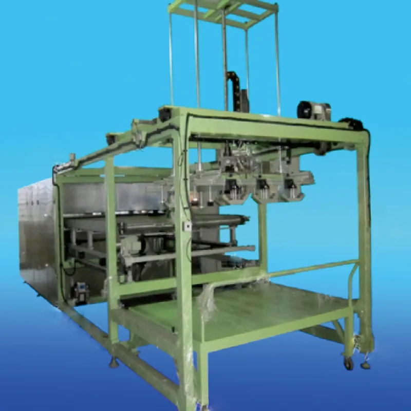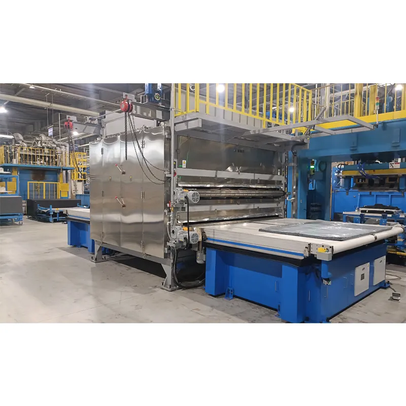 本ラインは主に自動供給機構、コンベアネット、乾燥炉、成形機等で構成されておる。ステンレス製ジグザグネットコンベアによる搬送方式を採用しています。赤外線セラミックヒーター搭載乾燥炉にてカーペット基材を加熱し、ニードル式自動供給機構による素材供給を行います。供給機構の幅は調整可能で、多様な製品サイズに対応可能です。ダブル乾燥炉加熱モード時における最大生産サイクルは55秒/枚です。