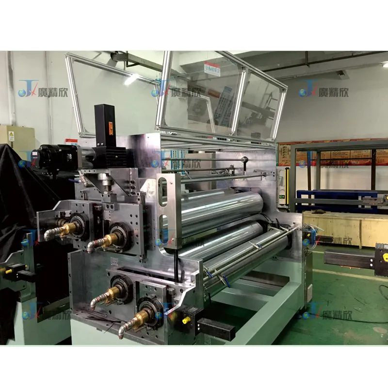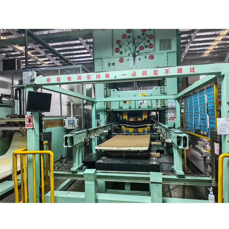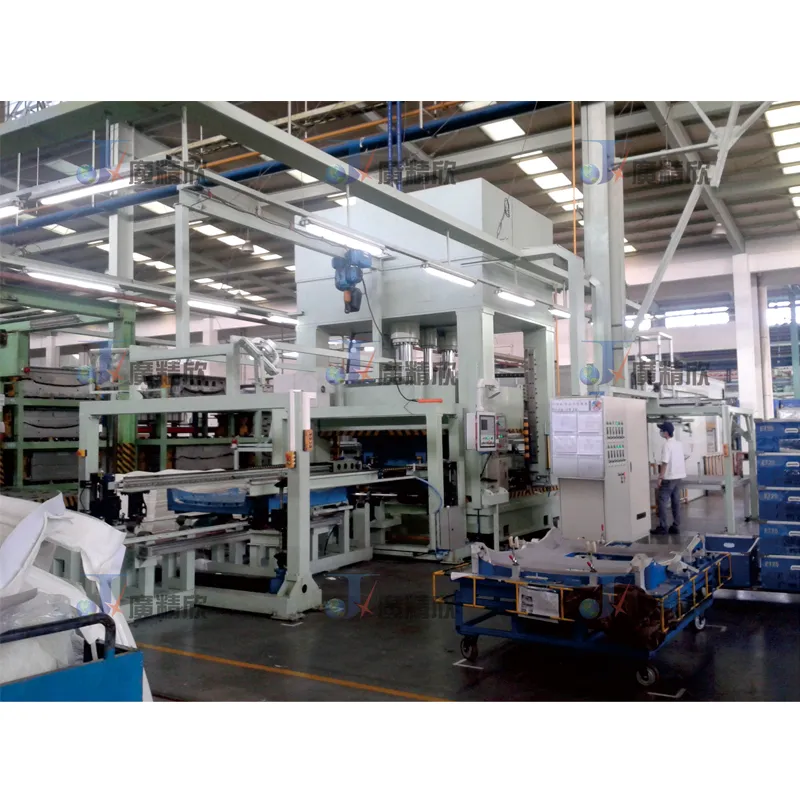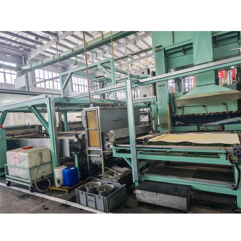 Принцип рада: усваја се процес лепљења горњих и доњих слојева ПУ плоче ваљањем лепка и прскањем ПУ плоча. Доњи ПУ слој је направљен од нетканог материјала и филца од стаклених влакана. Након што се пет слојева материјала наслага, они се шаљу у машину за обликовање у облику транспортне греде. Након обликовања и одржавања притиска, готов производ се вади помоћу хватаљке за рециклажу и шаље на ручну станицу за рециклажу или на следећи процес.